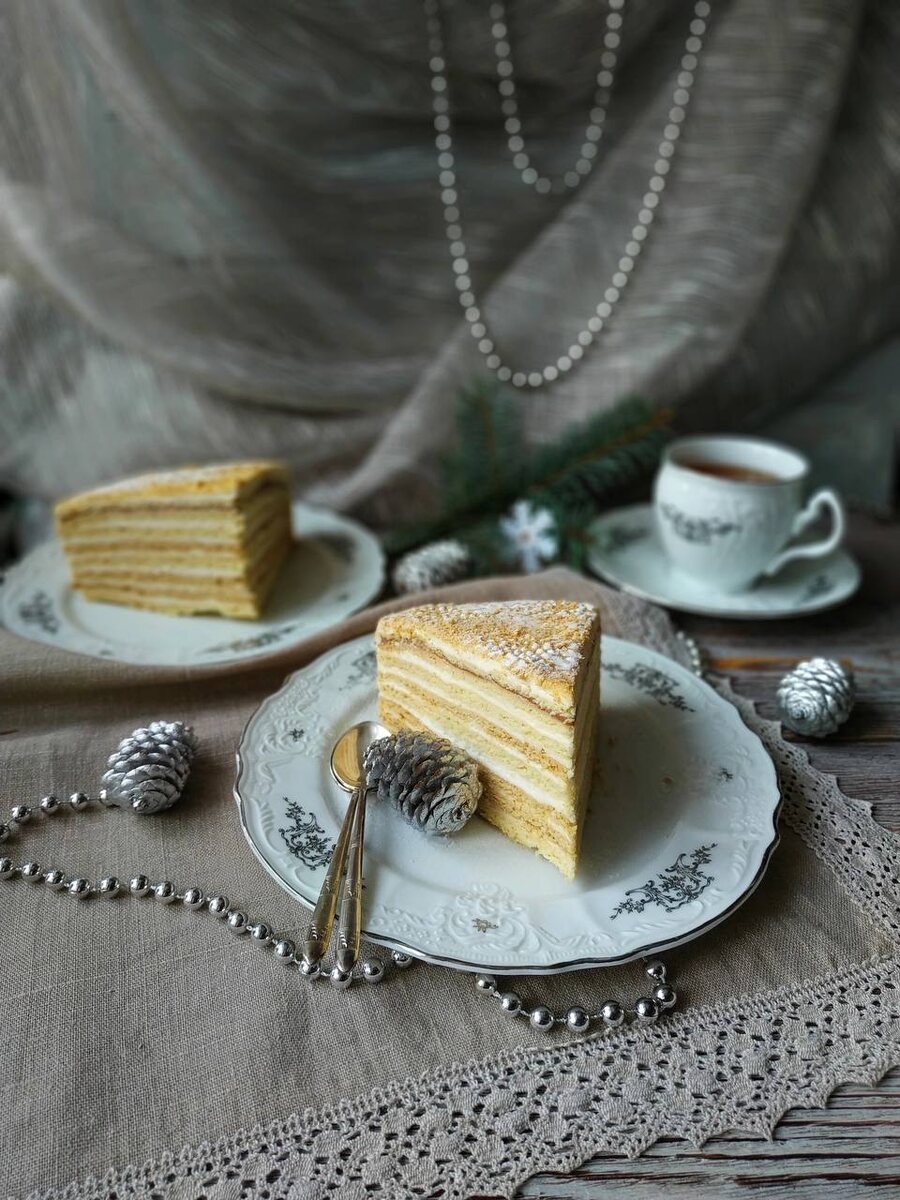 Ингредиенты: Тесто: ▫️мука — 450 г ▫️ яйца куриные — 2 шт. ▫️мед — 100 г ▫️сливочное масло — 100 г ▫️сахар — 80 г ▫️соль — 5 г ▫️сода — 6 г Крем: ▫️сметана 20% — 500 г ▫️сливки 33-35% — 250 г ▫️сахарная пудра — 120 г ▫️творожный сыр — 100 г ▫️сахар ванильный — 1 щепотка Способ приготовления: 1. В кастрюле с толстым дном перемешайте куриные яйца, сахар, соль. Добавьте сливочное масло и мед и подогрейте на водяной бане или слабом огне, постоянно помешивая. Масло, мед и сахар должны полностью растаять. 2. Когда масло и мед растают, добавьте соду, масса сразу побелеет, все хорошо перемешайте. 3. И сразу добавьте муку небольшими партиями, выместите тесто. 4. Тесто получается мягкое и теплое. 5. Переложите тесто в пакет и уберите в холодильник на пару часов. Я тесто сделала вечером накануне и убрала его на ночь в холодильник. 6. Когда тесто полежит в холодильнике, с ним очень легко будет работать. Я разделила тесто на 8 частей (я делала торт диаметром 22 см). Тесто раскатайте на пекарской бу