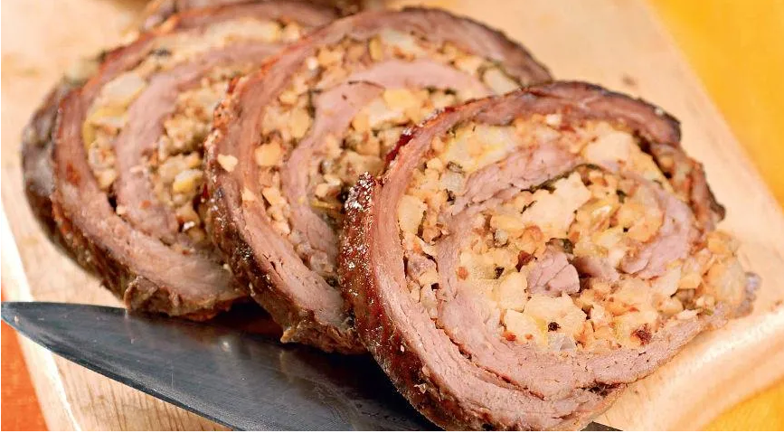 Вот уникальный рецепт рулета из говядины с яблоками и грецкими орехами, который сочетает нежную говядину с сладковато-ореховой начинкой. Особенность этого варианта — добавление мяты и сушёного майорана, что придаёт блюду ароматную нотку, а также использование сметаны и карри для смазывания рулета перед запеканием, что создаёт аппетитную корочку. Совет: чтобы рулет не развалился при запекании, можно использовать не только кулинарные нитки, но и зубочистки или специальную бечёвку для связывания мяса. Также важно не перегружать рулет начинкой, чтобы он не лопнул при термической обработке. Приятного аппетита!