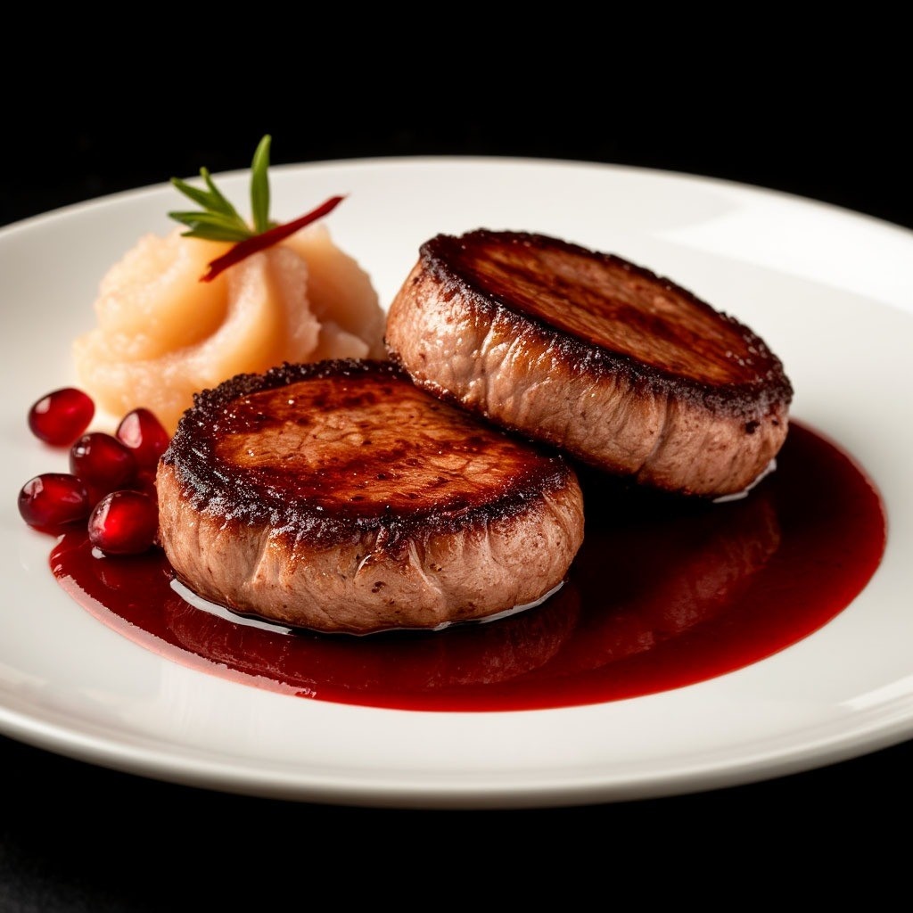 Если вы хотите удивить гостей мясным блюдом, но не готовы целый день стоять у плиты — эти медальоны ваш вариант. Они выглядят как в ресторане: идеально круглые, с глянцевым соусом и нежнейшим гарниром. А готовятся всего 30 минут. Беру свиную вырезку (около 600 г). Режу на куски толщиной 3–4 см. Каждый слегка отбиваю через плёнку, чтобы получились ровные круги. Натираю смесью соли, перца и молотого кумина (зиры). Быстро обжариваю на очень горячей сковороде с маслом по 1,5 минуты с каждой стороны — до корочки. Перекладываю в форму и отправляю в духовку, разогретую до 180°C, на 10–12 минут, до готовности. Пока мясо в духовке, делаю соус. В ту же сковороду, где жарилось мясо, вливаю 100 мл гранатового сока, 2 ст.л. бальзамического уксуса, 1 ст.л. мёда. Довожу до кипения, увариваю вдвое. В конце добавляю 1 ст.л. холодного сливочного масла, взбиваю венчиком, соус становится глянцевым. 2 спелые груши очищаю, режу, тушу с 1 ст.л. сахара и палочкой корицы до мягкости. Измельчаю блендером. Пода