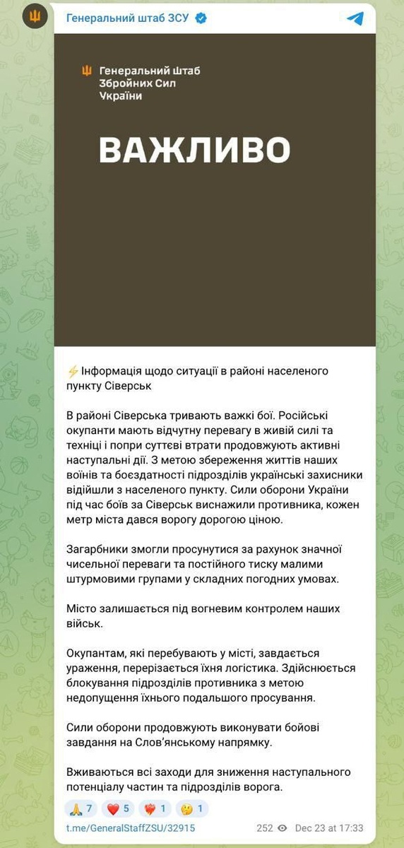 ❗️ ВСУ вышли из Северска, сообщает Генштаб украинской армии.