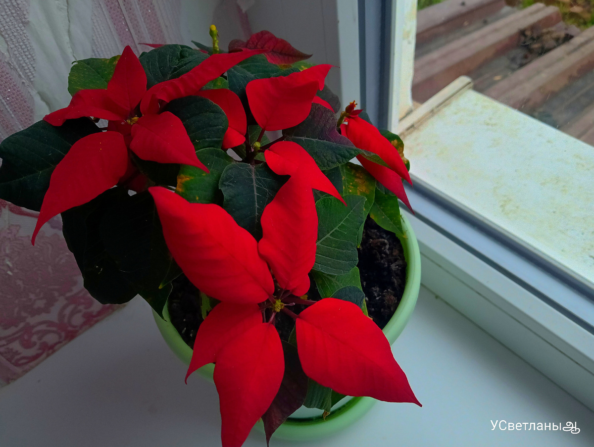 Вот и порадовал нас цветок Пуансетий или Рождественская звезда. Летом я его оболванила на пять сантиметров от корня, думали с мужем, что ничего с него уже не выйдет, ан нет, смотрите, какая красота. Можно сказать - жених.