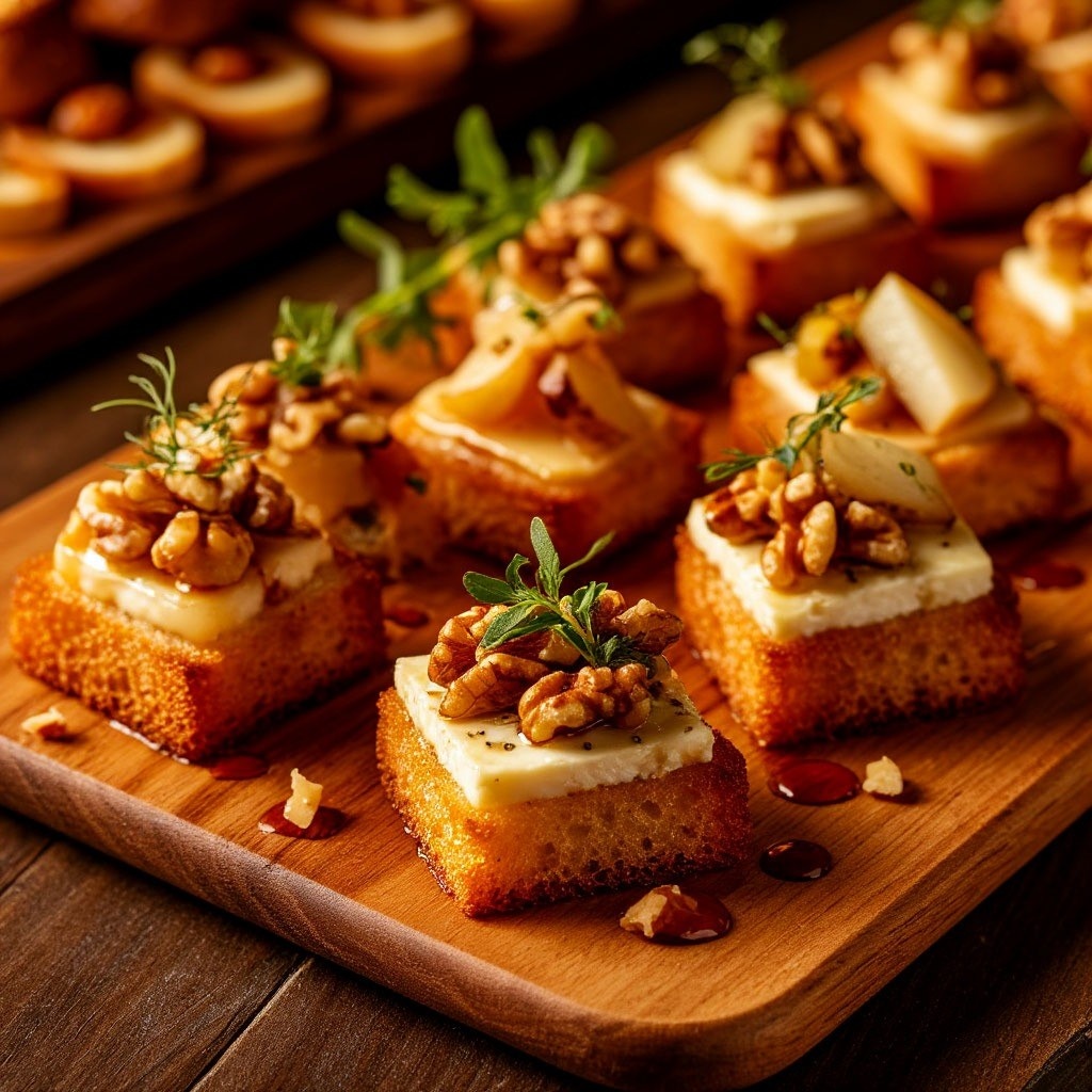 Когда гости уже собрались, а до основного ужина ещё час, нужны горячие закуски, которые готовятся за 10 минут. Выход — канапе. Это изысканное сочетание сладкого, солёного и острого. Беру бриошь или другую сладковатую булку, режу на ломтики толщиной 2 см, затем каждый ломтик на 4 квадратика. Слегка подсушиваю в духовке, а пока готовлю топпинг. 1 спелую, но твёрдую грушу режу тонкими ломтиками. 150 г горгонзолы (или другого голубого сыра) разминаю вилкой, смешиваю с 2 ст.л. сметаны — чтобы была пастообразная консистенция. Горсть грецких орехов слегка обжариваю и крупно рублю. Сборка: на каждый квадратик тёплого хлеба намазываю сырную пасту, кладу ломтик груши, посыпаю орехами. Выкладываю на противень и ставлю в разогретую до 200°C духовку на 5–7 минут. Пока канапе запекаются, делаю медовую заправку: 3 ст.л. мёда подогреваю с 1 ст.л. бальзамического уксуса и щепоткой чёрного перца. Достаю канапе, сбрызгиваю тёплым медовым соусом и сразу подаю. Хлеб хрустит, груша становится нежной, сыр