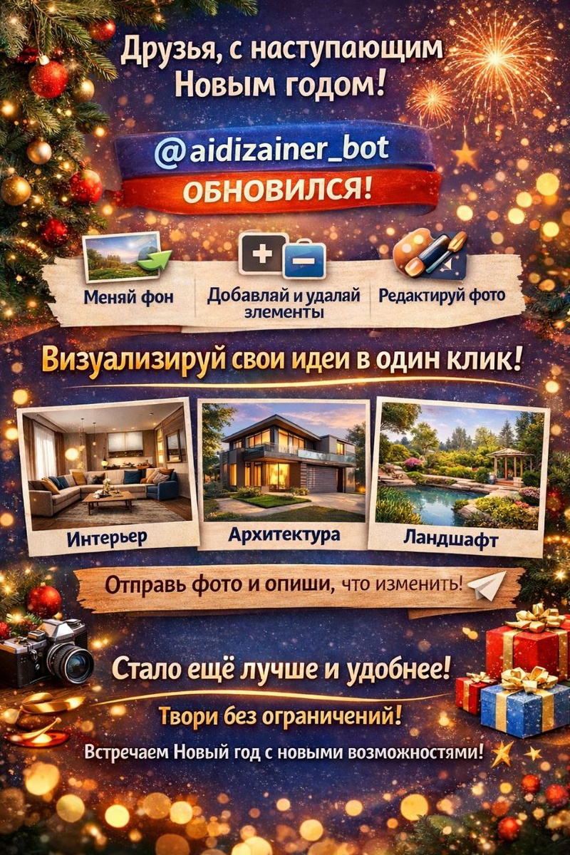 ! Мы рады поделиться отличной новостью — бот @aidizainer_bot обновился 🚀 Теперь вы можете работать с любыми фото и выполнять всё что захочется: ✨ менять фон ✨ добавлять и удалять элементы ✨ редактировать изображения ещё удобнее и быстрее 🎨 Визуализируй свои идеи в один клик! Интерьер, архитектура, ландшафт — просто отправь фото и опиши, что нужно изменить. Стало ещё лучше, быстрее и удобнее. Создавайте, экспериментируйте и воплощайте свои идеи без ограничений ✨ Пусть в новом году будет больше креатива и классных проектов! 🎉