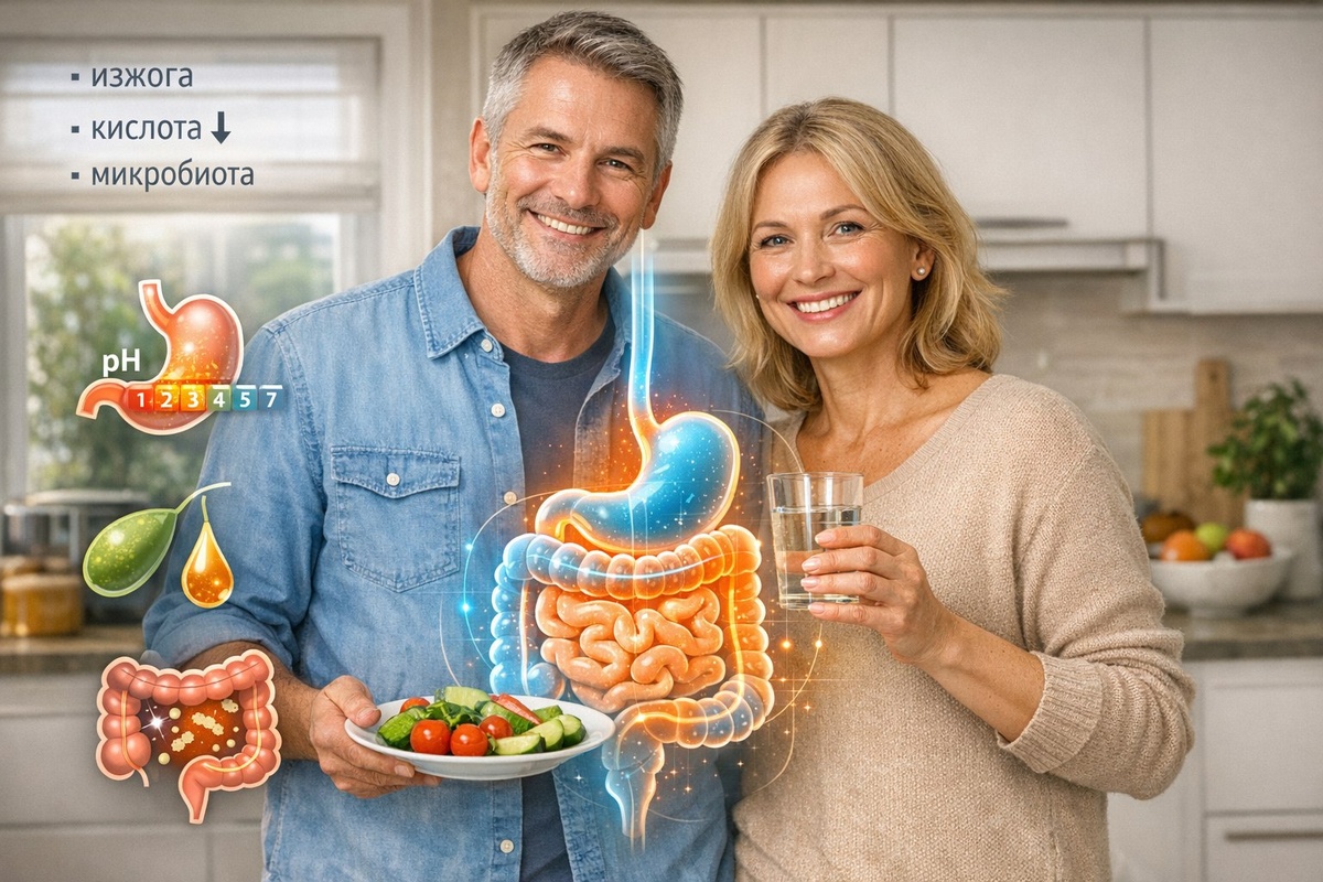 😊 🔬 Ключевые возраст-зависимые изменения – Тонус нижнего пищеводного сфинктера снижается → рефлюкс ощущается чаще. – Секреция соляной кислоты и пепсина постепенно падает (особенно у людей с Нр-позитивным гастритом) → медленнее расщепляется белок, хуже всасывается В₁₂, железо, кальций. – Поджелудочная железа вырабатывает меньше липазы и амилазы (в среднем −1 % в год после 40) → жирная пища переваривается дольше, возникает вздутие. – Желчь гуще из-за сдвига соотношения лецитина и холестерина → риск желчных камней и постпрандиальной тяжести. – Перистальтика толстой кишки замедляется, водный баланс сдвигается, микробиота теряет разнообразие → склонность к запорам и дивертикулёз. 🩺 Как это ощущается • изжога и «кислый» кашель по утрам; • чувство переполнения после обычной порции; • метеоризм, нерегулярный стул; • скачки энергии после углеводных перекусов; • лёгкий дефицит В₁₂/железа в анализах даже при нормальном питании. ✅ Что делать на практике 1. Питание 👉 старайтесь, чтобы полов