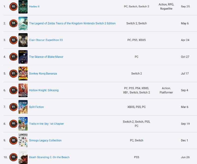 1. Hades II - 95 баллов 2. The Legend of Zelda: Tears of the Kingdom Nintendo Switch 2 Edition - 94 балла 3. Clair Obscur: Expedition 33 - 92 балла 4. The Seance of Blake Manor - 91 балл 5. Donkey Kong Bananza - 91 балл 6. Hollow Knight: Silksong - 91 балл 7. Split Fiction - 91 балл 8. Trails in the Sky 1st Chapter - 90 баллов 9. Simogo Legacy Collection - 90 баллов 10. Death Stranding 2: On the Beach - 90 баллов #игры@inyoueyes