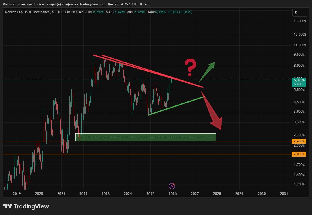 лонг. Что думаете, Вы за какой вариант? 🔥 - отскок и вниз пойдет USDT.D и альта полетит 🚀 🤯 - пробой и все снова красное будет 🩸