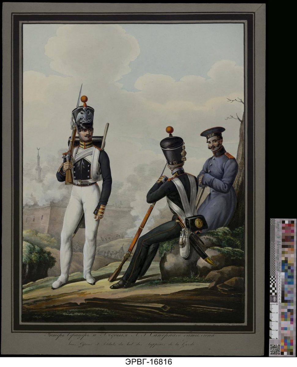 Раскрашенная литография XIX века из серии «Российская императорская гвардия. Пехота», созданная в соавторстве офицера и военного иллюстратора Льва Александровича Белоусова (1806–1854) и художника Самойло Петровича Шифляра (1786–1840) — одного из ведущих мастеров униформной графики Российской империи. На листе размером 41×30 см изображены два нижних чина Лейб-Гвардии Сапёрного батальона: унтер-офицер с отличительными знаками звания и рядовой в парадной форме. Работа выполнена на бумаге, вручную раскрашена с высокой точностью передачи деталей мундира, формы головного убора, снаряжения и знаков принадлежности к гвардейскому инженерному подразделению. Входит в коллекцию русской военной графики (инв. № ЭРВГ-16816), хранится в отделе геральдики. #РоссийскаяИмперия #ЛейбГвардия #СапёрныйБатальон #военнаяграфика #униформа #унтерофицер #XIXвек #Белоусов #Шифляр #геральдика #историяармии