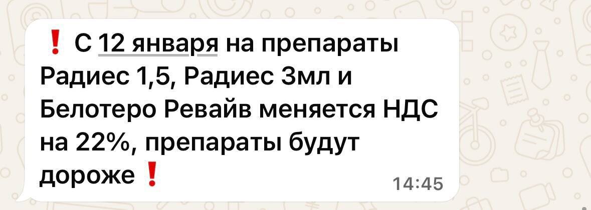 С 12 января цены на препараты вырастут из-за повышения НДС. Поэтому советуем записываться на процедуры заранее, тем более что в январе у нас действуют максимально выгодные предложения 👇 АКЦИИ С 4 ПО 12 ЯНВАРЯ ⏺ Фототерапия — только для тех, кто никогда ранее не делал процедуру 12 500 ₽ вместо 15 500 ₽ ⏺ Убираем отёки (SMAS-лифтинг): • 300 линий на щёки — 16 500 ₽ вместо 21 500 ₽ • 100 линий на второй подбородок — 6 500 ₽ вместо 8 500 ₽ ⏺ Radiesse: • 3 мл — 55 000 ₽ вместо 63 000 ₽ (–13%) • 4,5 мл — 67 000 ₽ (–33%) Последняя возможность! ⏺ RF-лифтинг (полная замена филлеров): • 3 зоны по цене 1 (Лицо + шея + декольте) — 55 000 ₽ вместо 75 000 ₽ • RF + 5 мл полимолочной кислоты — 67 000 ₽ вместо 84 000 ₽ • RF + 10 мл полимолочной кислоты — 80 000 ₽ вместо 101 000 ₽ ⏺ NCTF: • 1 флакон (лицо) — 12 000 ₽ • 2 флакона (лицо+ шея) — 17 000 ₽ • 3 флакона (лицо+шея +декольте) — 28 000 ₽ ⏺ Пилинг с экзосомами к любой процедуре — 1 500 ₽ вместо 4 500 ₽ ⏺ Нити — 35 000 ₽ вместо 60 000