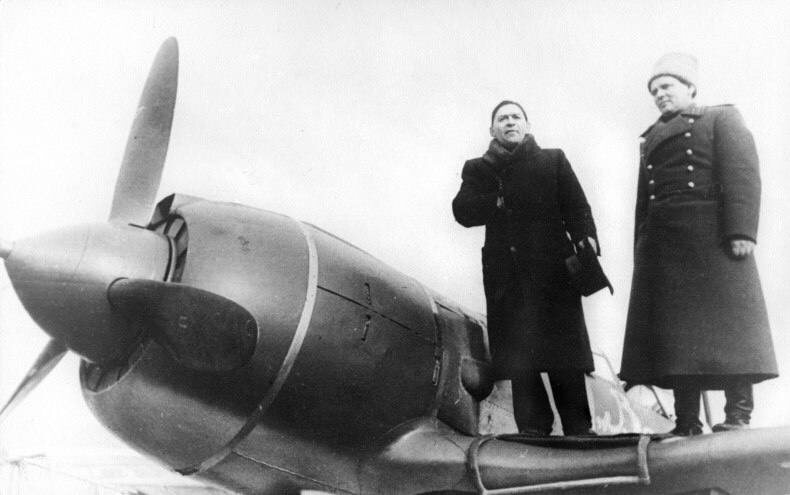 Леонид Утесов на крыле истребителя Ла-5Ф, построенного на средства его ансамбля «Веселые ребята». Момент передачи машины в войска.