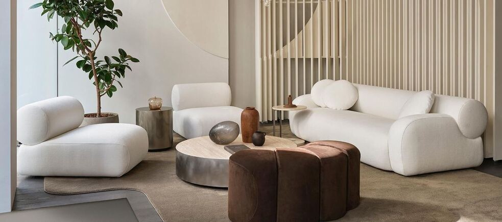 Органичные формы — одно из самых устойчивых направлений последних лет. Но тенденция меняется: если раньше плавные линии были скорее декоративным жестом, то сейчас они становятся полноценной архитектурной логикой. Закруглённые диваны и модули позволяют зонировать пространство без перегородок, кухонные острова приобретают скульптурные очертания, дверные проёмы стремятся к арочным силуэтам.