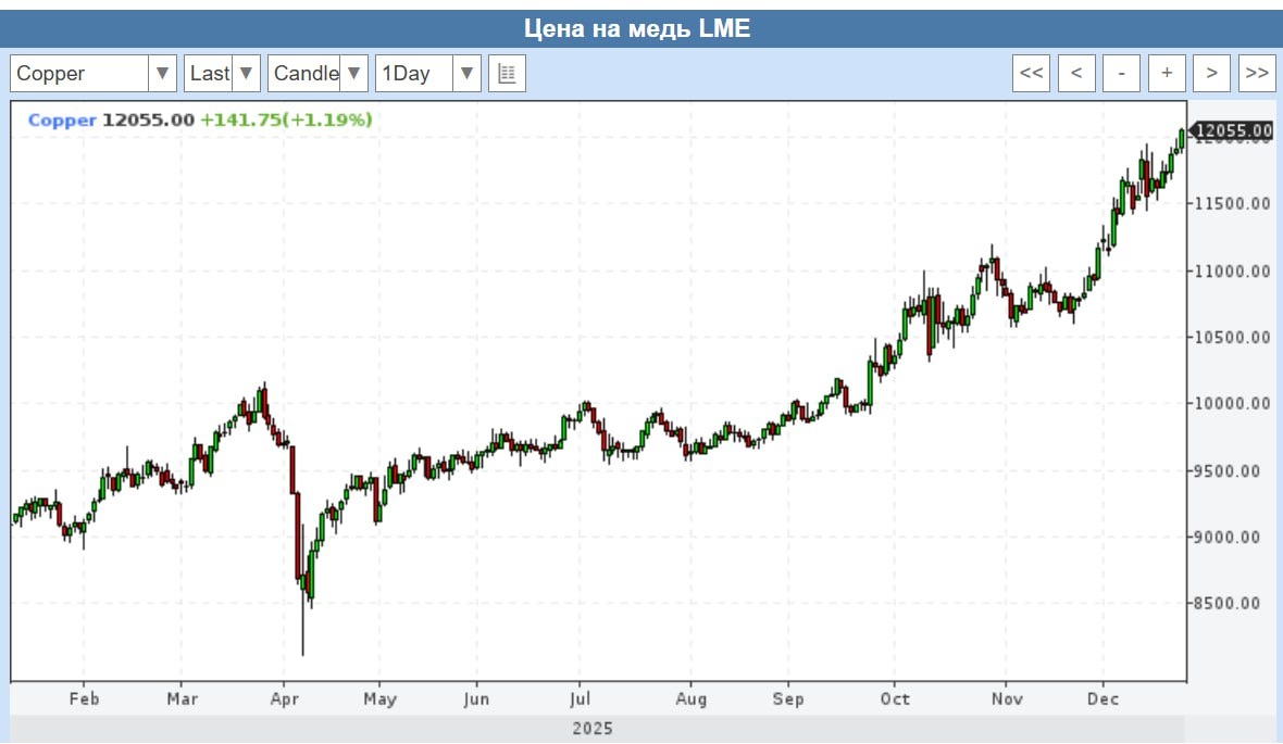 ‼️Цена на медь достигла нового исторического максимума, превысив отметку в 12 000 долларов за тонну, и этот важнейший промышленный металл