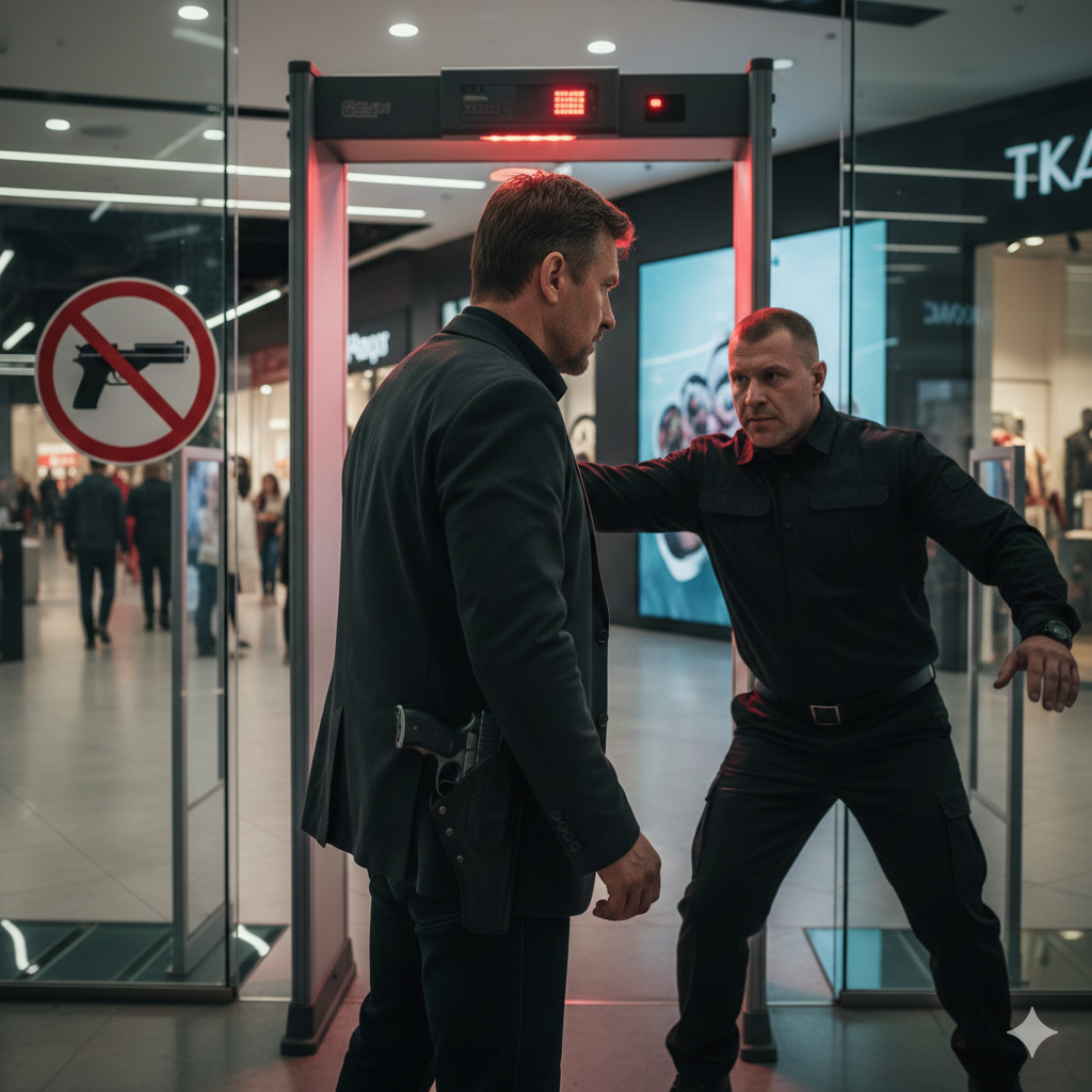 Ситуация классическая: вы заходите в крупный ТЦ, на поясе в кобуре — верный «Гроза» или «МР-79», а на входе рамка металлодетектора заливается звоном. К вам уже спешит человек в черной форме с надписью «Охрана».