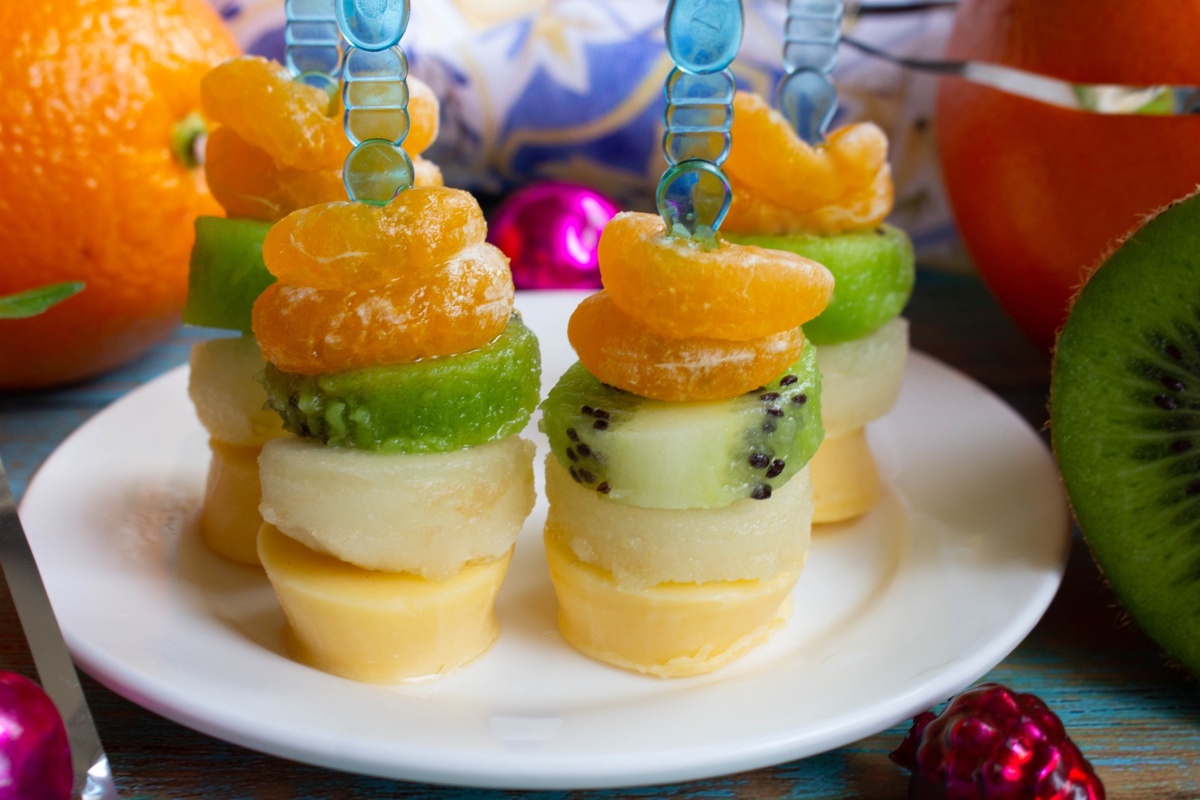 Простые канапе, которые и готовить 10 минут, и съедаются они очень быстро. Такие нарядные канапе хорошо подать как сопровождение к вину, шампанскому. Этот рецепт скорее просто как идея, а канапе всегда можно сделать под свой вкус и добавить: виноград, клубнику, оливки, ананас, банан, авокадо, апельсин. Сыр для приготовления выбирайте свой любимый. Мандарины хорошо взять мелкие, чтобы дольки были небольшие. Если в мандаринах есть косточки, то их убираем. Яркие фруктовые канапе поднимут аппетит и настроение. Готовить такое незамысловатое блюдо можно с детворой. Сыр - 50 г. Киви - 0.5 шт. Груша - 1 шт. Мандарин - 2 шт. Подготовим ингредиенты, почистим фрукты. От сыра отрежем пластинку той толщины, которая вам нужна для канапе. Продавим сыр любой удобной маленькой круглой формочкой, сделаем сырные кружочки. Если формочки нет, используйте крышку от пластиковой бутылки. Также сделаем кружочки из киви и груши. Мандарины разберем на дольки. Нанизываем на шпажки пару мандариновых долек, затем