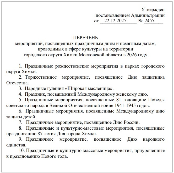 На сайте администрации сегодня вышло постановление о утверждении перечня мероприятий, посвященных праздничным дням и памятным датам, проводимых в сфере культуры на территории городского округа Химки Московской области в 2026 году. Как всегда, подписала этот документ Глава Химок Елена Землякова, а контроль за выполнением настоящего постановления возложили на заместителя Главы городского округа Ватутину А.Э.