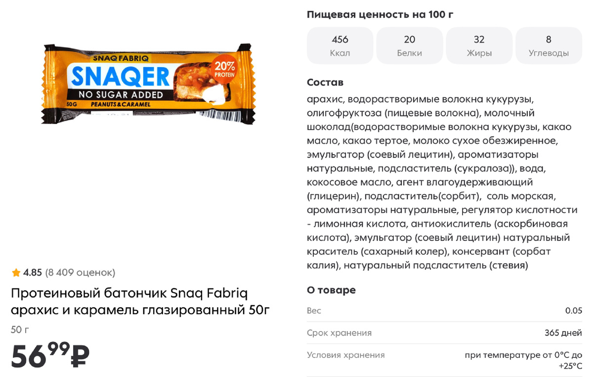 Разберём подробно на примере популярного батончика Snaq Fabriq арахис–карамель глазированный (50 г).