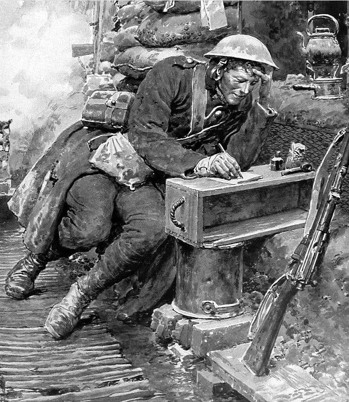 Trenches). Она была опубликована на обложке британского журнала The Sphere 23 декабря 1916 года. На рисунке изображен британский солдат (которого часто называют «Томми»), сидящий в заснеженном окопе времен Первой мировой войны и пишущий письмо своей семье к Рождеству. Матания был известен своим фотореалистичным стилем и работал официальным военным художником, создавая графические репортажи с Западного фронта на основе личных визитов и зарисовок. Иллюстрация передает эмоциональный и личный аспект войны, подчеркивая желание солдат поддерживать связь с домом в тяжелых условиях фронта. #art@wwimemes