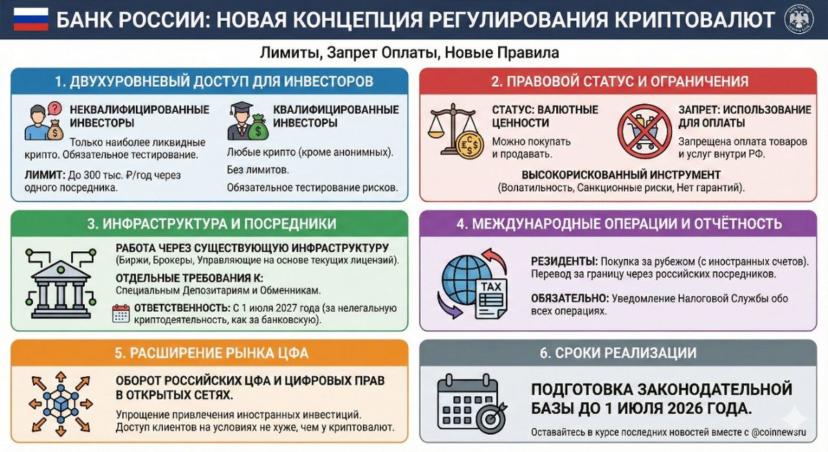 🇷🇺 Регулятор выкатил Обновления по использованию криптовалют в России. На сегодня и неквалифицированные инвесторы смогут покупать, но только на небольшие суммы. Ну а остальное, в целом, в прежних рамках - закон в готовом виде нам подадут к середине 2026 года. Можете сами посмотреть на инфографику 🤌
