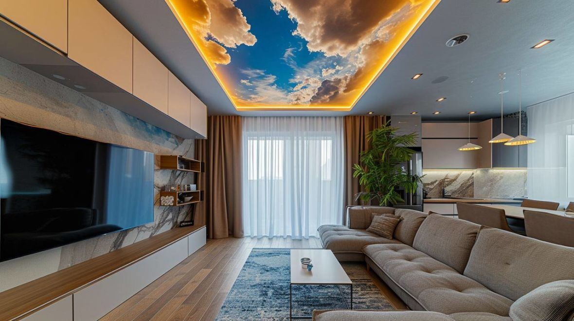 · Портфолио с ценами. Не просто галерея, а каталог решений с указанием стоимости «от». «Потолок в спальне с фотопечатью — от 3500 ₽/м²».