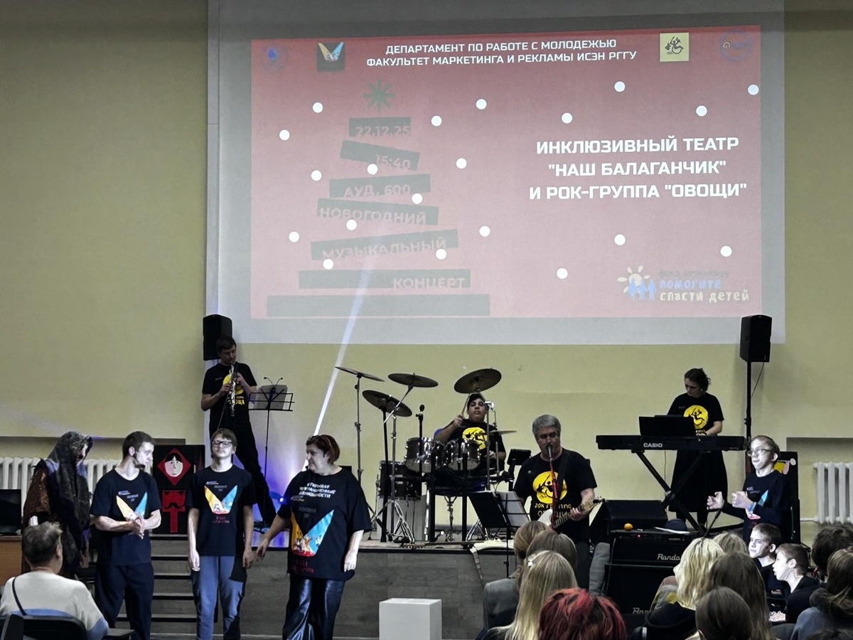 спектаклей Инклюзивного театра «Наш Балаганчик» и любимых песен рок-группы «Овощи». Атмосфера была волшебной: зал наполнен до отказа, у всех в глазах эмоции. Многие потом признавались: «Мы плакали…» – но не от грусти, а от трогательного, живого, настоящего чувства, которое невозможно передать словами. При этом вечер был не только душевным, но и очень шутливым – смех соседствовал со слезами, а искренние аплодисменты сменялись тёплыми объятиями. В финале – мандарины для всех, совместное исполнение любимой новогодней песенки «Ёлочка» и… хоровод! Студенты, юные артисты, зрители – все кружились, как в детстве, не желая расставаться. После концерта никто не спешил домой: знакомились, общались, брали интервью, а ребята из числа студентов даже предложили помочь с демонтажем и погрузкой декораций. Расстались не просто довольными – расстались друзьями. Спасибо каждому, кто был с нами! До новых встреч в новом году! 🎁🎶