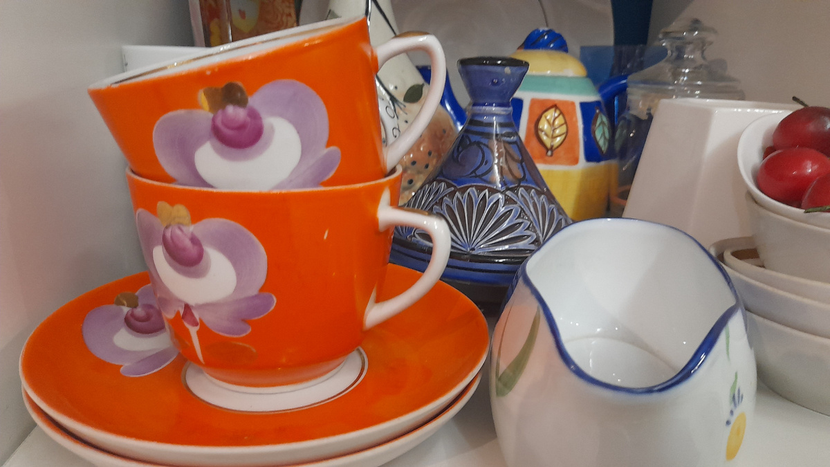 Перед Новым годом снова решила наведаться в комиссионный магазин, о котором писала здесь. Ещё в первый раз присмотрела там Южноуральские чайные пары любимого оранжевого цвета, но тогда забыла спросить о них. В это раз с них и начала. Их было три пары, выбрала самую лучшую. Клеймо лилия (1963 - 1973 гг). Стоила пара 350 руб. Нового, по-моему, ничего особенно не добавилось, просто постаралась внимательнее ко всему присмотреться. Хотелось что-нибудь ещё себе выбрать. Давайте посмотрим вместе. На этой полке и на других очень много Сысертского фарфора, но я не любитель старой Сысерти. Сейчас, на мой вкус, у них фарфор гораздо интересней. Хотя тогда завод имел своё особенное лицо, был сразу узнаваем. Я бы их росписи назвала "фольклорными", что ли. Могу как-нибудь посетить фирменный магазин "Фарфор Сысерти" и показать вам их современную продукцию. Также на полке можно видеть чайную пару ЛФЗ "Бабочки". Костяной фарфор, за неё просили 1500 руб. Чайная пара "Рубин" Дулёво, 900 руб. Я в начале