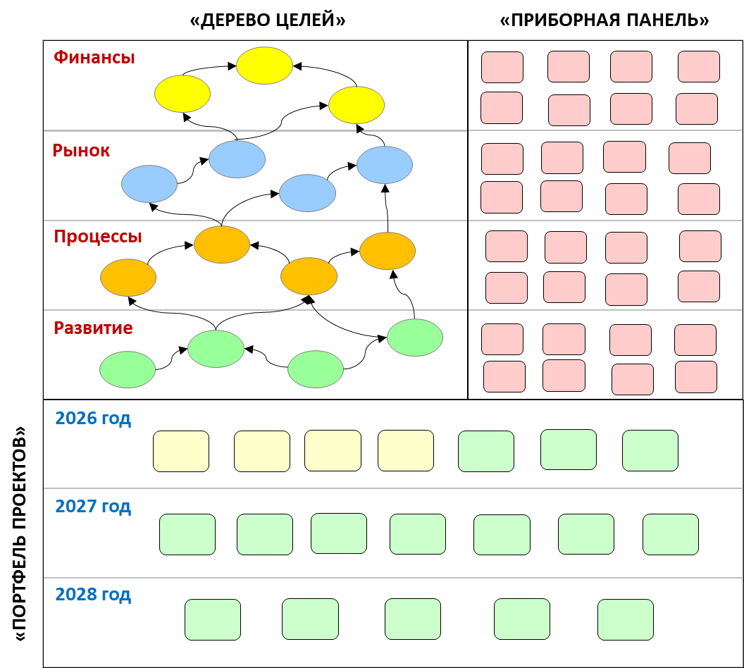 Олег Кулагин Друзья, приветствую вас! В конце уходящего года крайне важно и полезно порефлексировать на тему стратегии компании, обновить стратегические цели и портфель проектов по развитию организации. О том, как это делать, мы уже много и долго рассуждали. Вы можете заглянуть в архив рассылок по стратегическому управлению и при желании перечитать понравившиеся статьи. Но, помимо содержания, форма представления результатов работы над стратегией также очень важна! Все должно быть красиво, наглядно и солидно! В частности, стратегическую карту вы можете оформить на специальной шаблоне, состоящем из трех частей: 1. Стратегические цели («дерево целей»). Это, собственно, и есть стратегическая карта в традиционном понимании, включающая в себя стратегические цели по четырем перспективам (финансы, рынок, процессы, развитие), связанных между собой причинно-следственными отношениями. При этом цели разных уровней желательно обозначать разным цветом, например, желтым, голубым, оранжевым, зеленым.