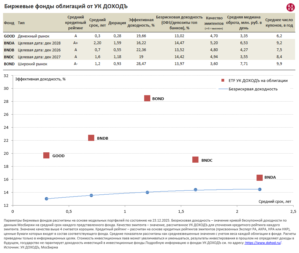 В таблице и на графике ниже представлены основные параметры всех наших биржевых фондов облигаций по состоянию на 23 декабря 2025 года - от средних сроков и эффективных доходностей к погашению, до среднего качества и рейтинга эмитентов. Текущие доходности ОФЗ и банковских депозитов на сопоставимые сроки приведены в столбце "Безрисковые доходности" и отдельной кривой доходностей на графике. Изменение цен паев за месяц: В декабре происходит переоценка кредитных рисков некоторых заемщиков в сторону повышения, что негативно отражается на рынке корпоративных облигаций в целом. Это хорошая иллюстрация к факту того, что цены облигаций не всегда только растут. Наиболее известным триггером этой переоценки стали бумаги Уральской стали после выхода плохой отчетности и последующего снижения кредитного рейтинга от АКРА сразу до BB-(RU) (с развивающимся прогнозом) с гораздо более высокого уровня A(RU). 25 декабря запланировано погашение бумаг эмитента (RU000A105Q63) на 10 млрд. руб. Тогда во многом и