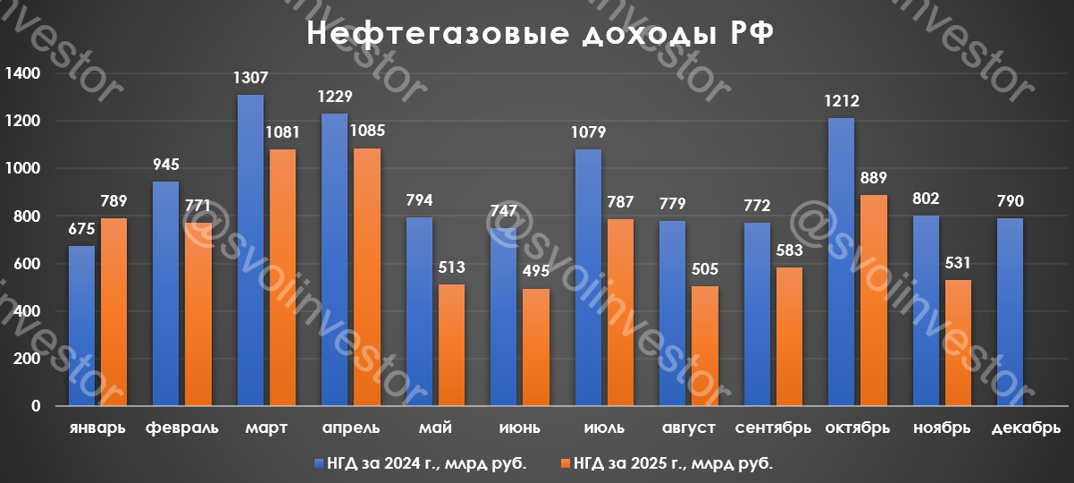 По данным Минфина, НГД в ноябре 2025 г. составили 530,9₽ млрд (-33,8% г/г), месяцем ранее — 888,6₽ млрд (-26,7% г/г). Нефтегазовые доходы продолжают снижаться по отношению к прошлому году, всё из-за укрепления ₽, санкций, пошлин и снижения цены на сырьё (средний курс $ в ноябре 2024 г. — 100,7₽, цена Urals — 63,48$). Средний курс $ в ноябре 2025 г. составил 80,3₽ (в октябре — 80,9₽), средняя же цена Urals снизилась до 44,87$ за баррель по данным МИНЭК (в октябре — 53,68$), как итог цена за бочку в октябре была равна ~3603₽ (в октябре — 4342₽). С новыми правками по бюджету средний прогнозный курс $ за 2025 г. снизился с 94,3 до 86,1₽, цена Urals выросла с 56 до 58$, ноябрьские поступления для бюджета катастрофически малы. Рассмотрим полноценно отчёт: 🗄 НДПИ (650,5₽ млрд vs. 671,3₽ млрд месяцем ранее). РФ в 2024 г. 6 месяцев не придерживалась плана сокращения, в начале 2025 г. происходила компенсация по добыче за ранее превышенные квоты, но начиная со II кв. РФ уже наращивает добычу. В