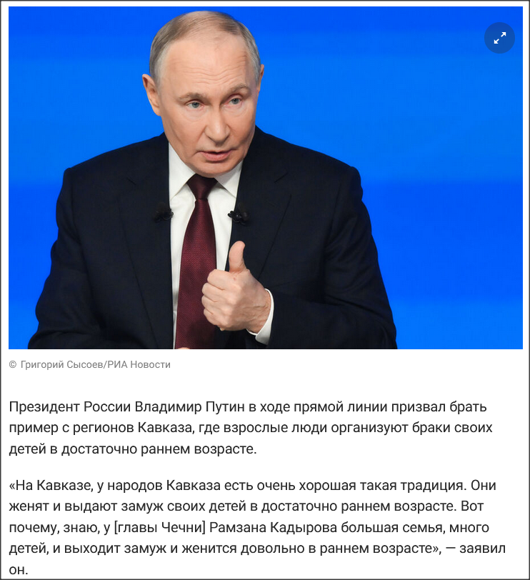 «У народов Кавказа есть хорошая традиция - они женятся или выходят замуж в раннем возрасте, надо брать с них пример», - далее в качестве примера, если быть конкретнее, Путин вспомнил семью Рамзана Кадырова.
