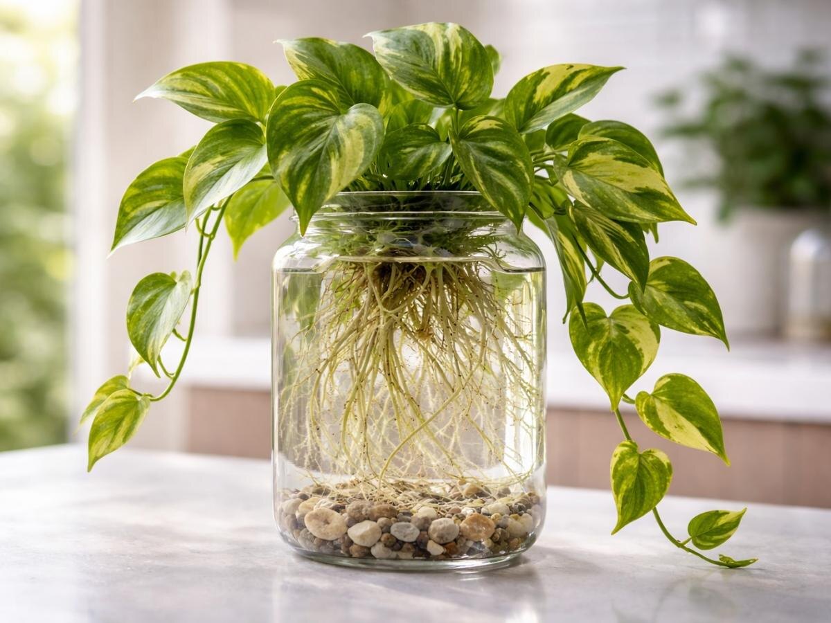 Комнатные растения могут расти не только в горшках с грунтом — все больше людей выбирают минималистичное озеленение в воде. Такие композиции выглядят легко, современно и особенно эффектно вписываются в интерьер кухни или ванной. При этом уход за ними зачастую проще, чем за классическими посадками. Многие комнатные культуры биологически приспособлены к образованию корней в водной среде. Обычно этим пользуются для черенкования, но на практике ряд растений способен годами существовать без почвы. При достаточном освещении, регулярной смене воды и минимальных подкормках они сохраняют декоративность и продолжают рост. Для выращивания подходят стеклянные вазы, колбы и банки. Воду можно использовать водопроводную, но при высоком содержании хлора ее желательно отстаивать 24-48 часов. Чтобы вода дольше оставалась прозрачной, на дно емкости часто кладут активированный уголь или декоративную гальку. Растениям в воде необходимы питательные вещества, поэтому раз в 7-10 дней добавляют водорастворимые
