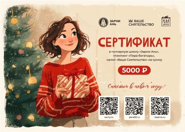🎁 Спешите! Только с 22 по 27 декабря приобретайте мультисертификат на любую сумму от 5 000 ₽ — и получайте второй БЕСПЛАТНО 🎉 Потратить можно: 🏕 На проживание в глэмпинге Pera – незабываемый отдых на природе в уютных шатрах на берегу моря 🍶 На групповые и индивидуальные мастер-классы в гончарной школе «Зарни Ань» – создайте шедевр из глины своими руками и окунитесь в мир волшебства гончарного дела 👑 На любые услуги салона «Ваше Сиятельство», за исключением смас-лифтинга и абонементов – подарите себе моменты красоты и релакса 💌 Сертификаты действуют до 31.03.26г. включительно – в Симферополе и Севастополе – в глэмпинг Pera на будние дни ‼ Количество сертификатов ограничено - 4 на город. Не упустите шанс удвоить впечатления! Бронируйте прямо сейчас в лс группы #сертификаты#ЗарниАнь