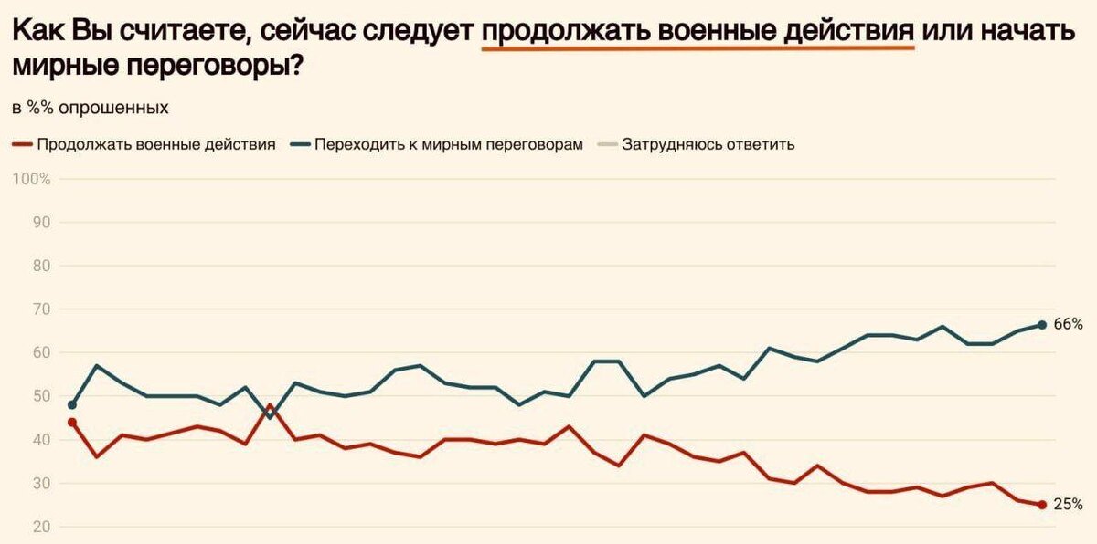 66% жителей России ждут немедленных мирных переговоров, о чём говорят данные опроса «Левада-центра». Это рекордное число за всё время продолжительных военных действий. Антирекордное число показывают и те, кто выступает за продолжение СВО, их число из опрошенных снизилось с 45% до 25%.