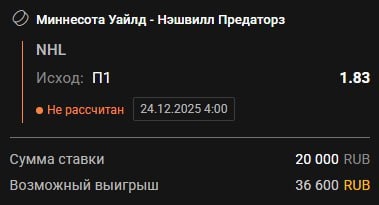 🏒🏒🏒🏒🏒 🌲Миннесота - 🐅Нэшвилл С приходом одного из лучших защитников лиги Куинна Хьюза Миннесота воодушевилась и выдала серию из семи побед подряд, проиграв лишь Колорадо (им сейчас равных в лиге нет). Дома "Дикари" по сезону действуют уверенно, а вот Нэшвилл на выезде играют плохо. Не вижу причин, за счёт чего гости должны зацепиться в сегодняшней встрече. Прогноз: П1
