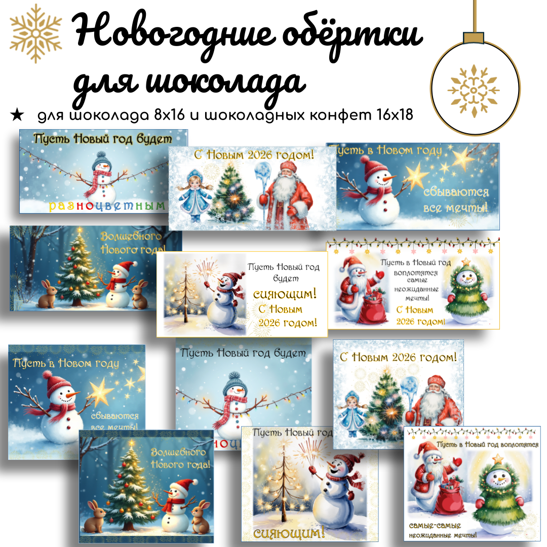 Данная разработка представляет собой новогодние обёртки на шоколад - готовые шаблоны для печати, с помощью которых можно быстро оформить стандартную плитку шоколада в праздничный подарок.