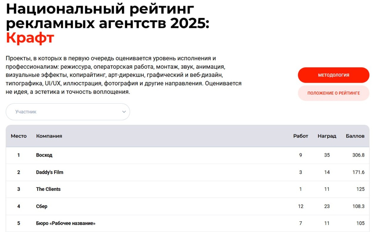 В категории «Крафт» отметили проекты с высоким уровнем исполнения, где внимание к деталям, визуальная точность и технические решения работают на идею и усиливают коммуникацию. С заметным отрывом первое место заняло агентство «Восход». Работы команды неоднократно получали награды на профессиональных фестивалях, первые места и попадали в шорт-листы ключевых отраслевых конкурсов. Результат агентства обеспечили проекты «"Точка". Меняй работу», GUN, Manizha, Voskhod for Peace и Live a life! для «Брусники». Эти кейсы наглядно показали, как крафтовое визуальное исполнение и сложные технические решения могут превращать ролики в цельное и самостоятельное высказывание. 😀 Пожалуй, лучший телеграм-канал о маркетинге
