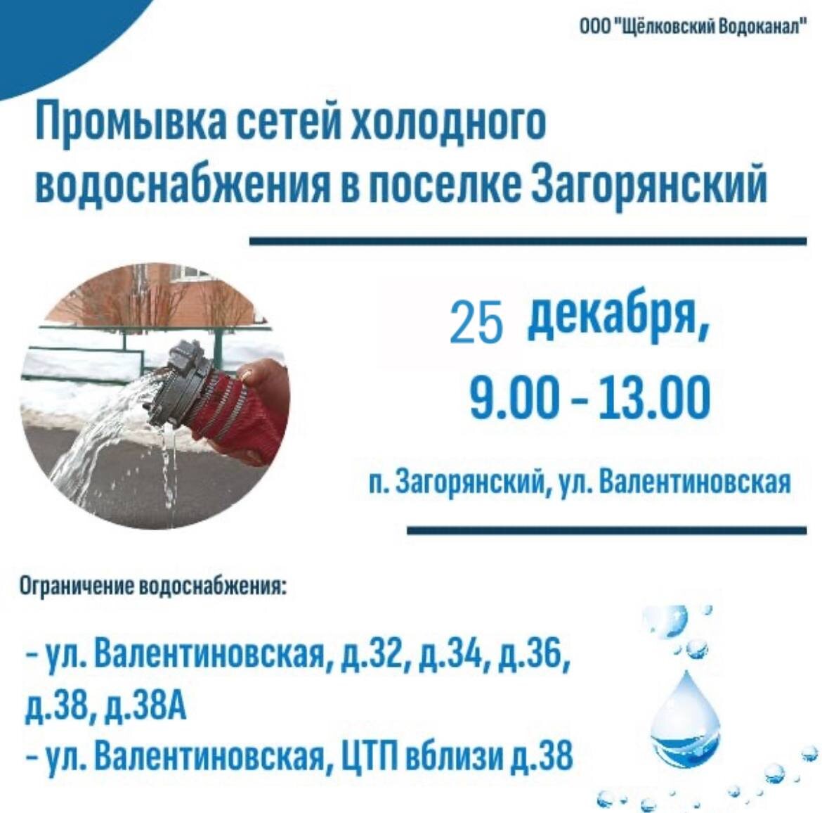 В связи с проведением гидропневматической промывки сети ХВС (п. Загорянский, ул. Валентиновская) 🤩 декабря, с 9.00 до 13.00 будет отключено холодное водоснабжение: ➡️ ул. Валентиновская, д.32, д.34, д.36, д.38, д.38А ➡️ ул. Валентиновская, ЦТП вблизи д.38 ❗️После подачи воды возможно кратковременное ухудшение качества ресурса после восстановления водоснабжения. Приносим извинения за доставленные неудобства. 📞 Телефон аварийно-диспетчерской службы водоканала: 8-496-562-11-72. Подписаться 🟦Вакансии 🟦Личный кабинет 🟦Чат-бот