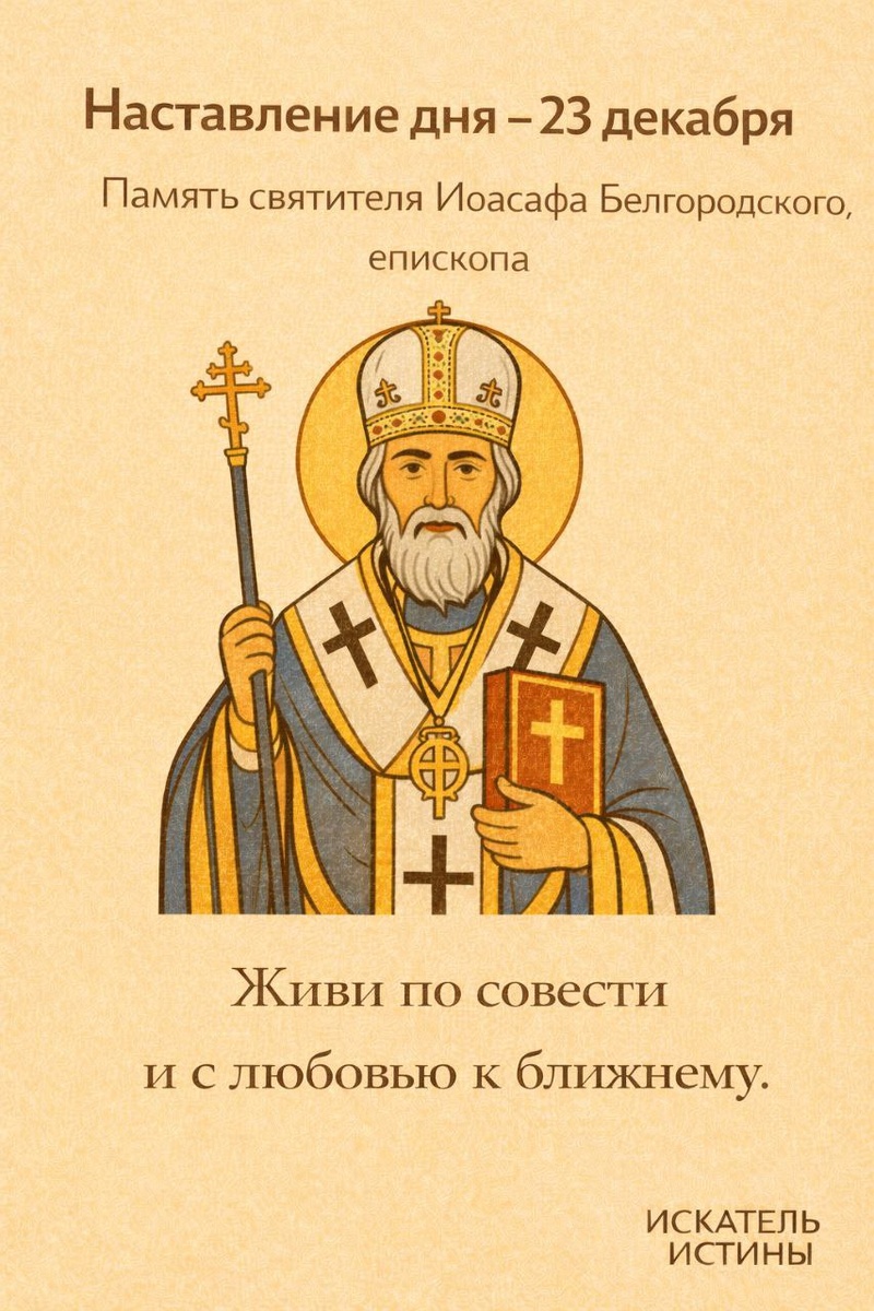 Память святителя Иоасафа Белгородского, епископа Святитель Иоасаф Белгородский был пастырем кротким, молитвенным и исполненным живой любви к людям. Он заботился о каждом, кто приходил к нему за советом и утешением, и учил прежде всего жить по совести, соединяя веру с делами милосердия. Его жизнь свидетельствует: истинная святость рождается в тихом служении, внимании к ближнему и постоянной молитве. Пусть и твой день будет наполнен добротой сердца, миром души и стремлением творить добро ради Бога.