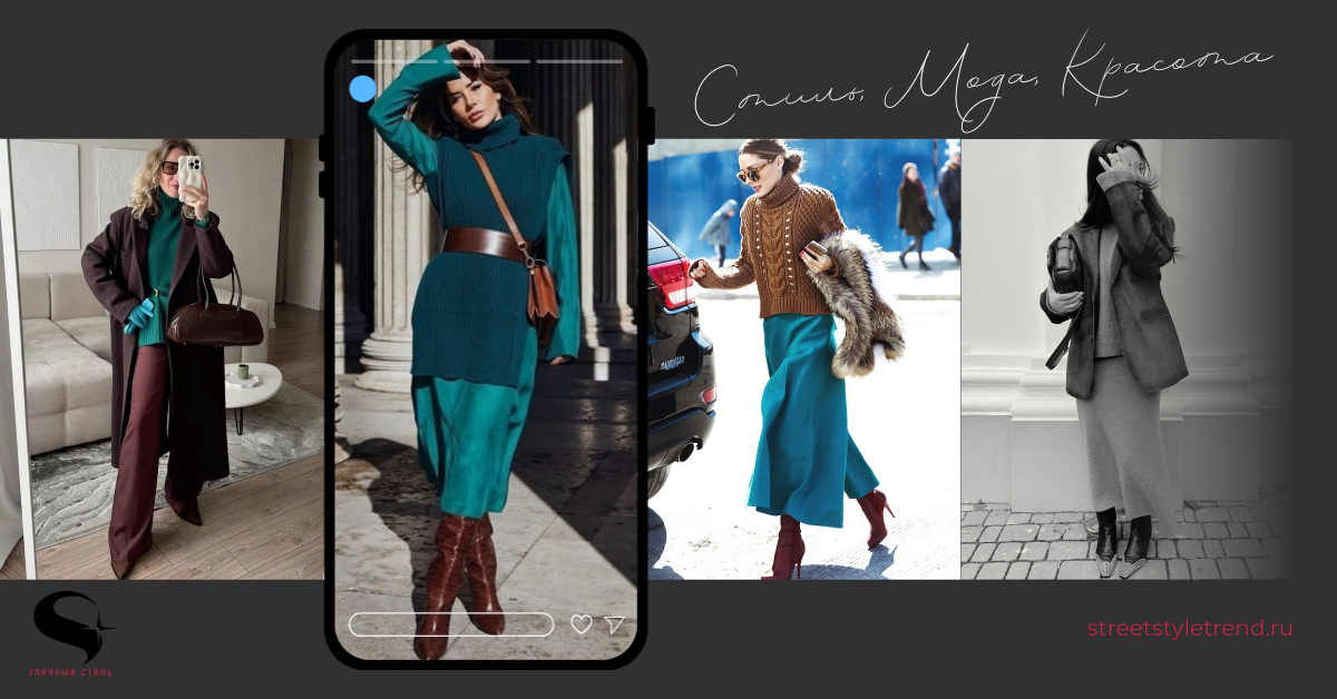 Образ: Коричневое шерстяное платье-миди + бирюзовый пояс и сумочка + замшевые ботинки. Эффект: Богатый, драматичный, зимний и роскошный. Напоминает драгоценные камни в оправе.