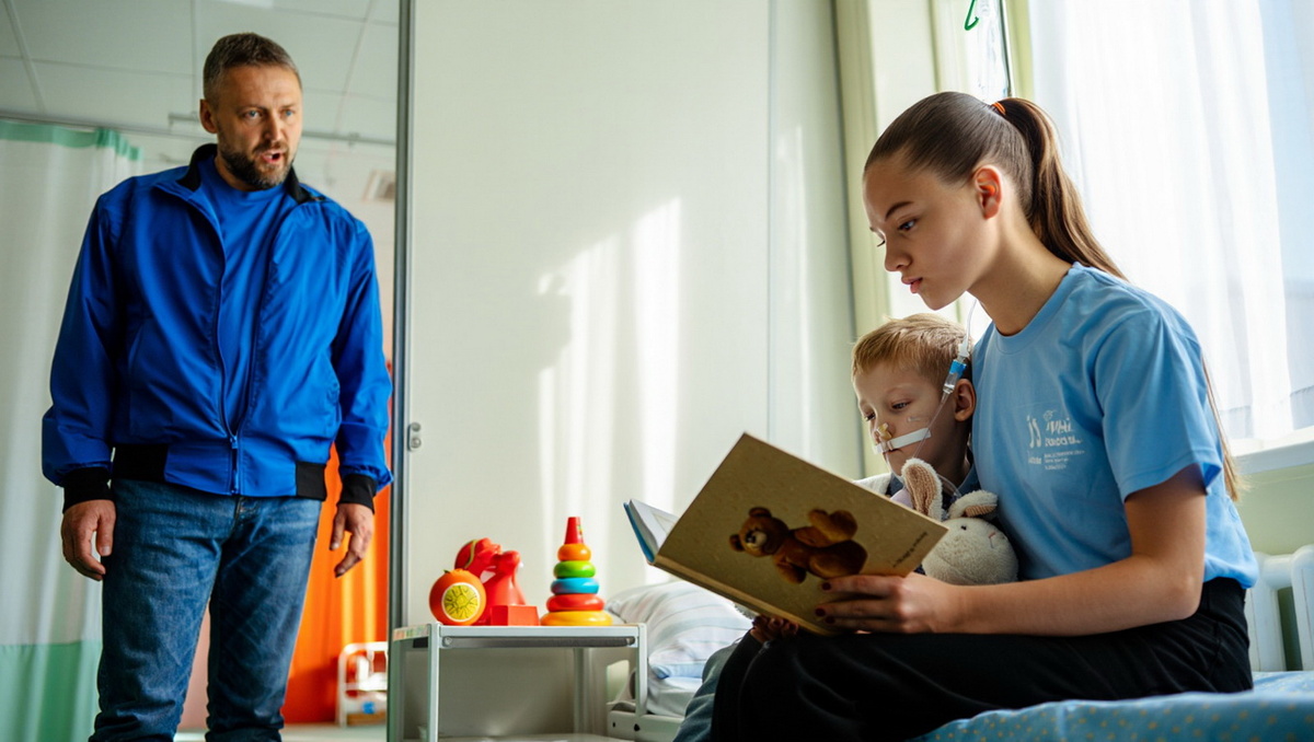 Маша сидела на стуле возле кровати, где лежал мальчик лет пяти. Маленький, бледный, с капельницей в руке. А она читала ему книжку и показывала картинки. На ней была голубая футболка с надписью «Волонтёр». Волосы собраны в хвост.