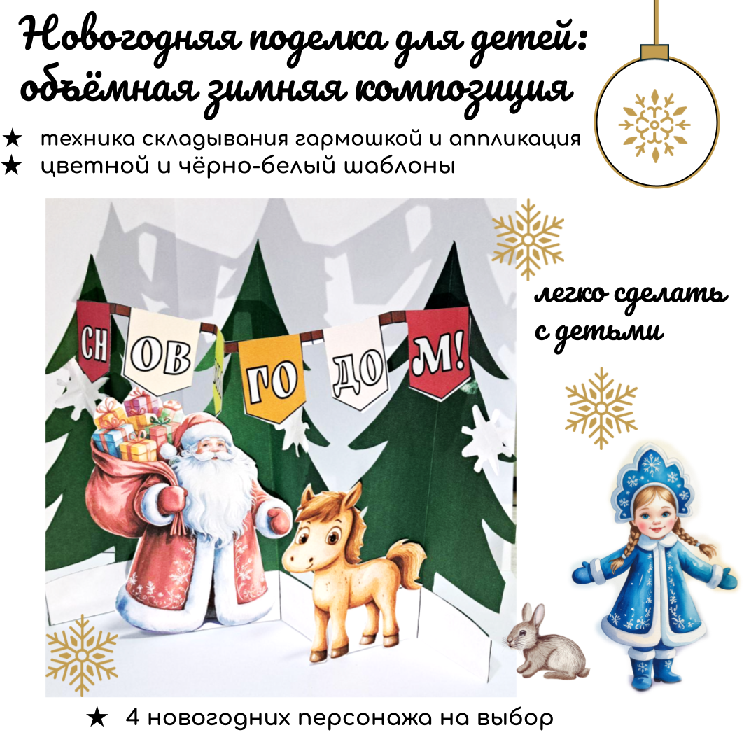 Данная разработка представляет собой новогоднюю поделку из бумаги для детей, выполненную с использованием техники складывания гармошкой и аппликации. В результате работы получается объёмная зимняя композиция с изображениями новогодних персонажей в зимнем лесу и надписью "С Новым годом!". Поделка на Новый год подходит для детского сада или школы, она может служить основной идеей творческого занятия или предметом новогоднего оформления класса.