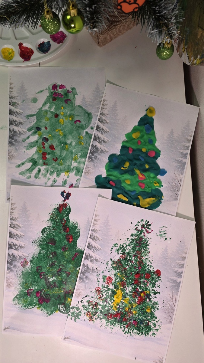 + шаблон Показываю в видео несколько простых, но очень классных техник, которые подойдут даже малышам от 1-1,5 лет. Мы делали на основе моего шаблона: там уже есть фон и очертания ёлки, остаётся только творить! Файл прикрепила в комментариях к посту ⤵️ Вот какие техники мы использовали с ним: 🤩Рисование трубочкой На одном конце толстой трубочки сделала надрезы. София макала в зелёную краску, так получались классные отпечатки иголочек. А на другой конец прикрепила салфетку, ею дочь ставила штампы разными цветами. 🤩Рисование спонжем/губкой. Ещё пробовали рисовать спонжем. Просто макали в зелёную краску и заполняли ёлку. А потом взяли несколько ватных палочек, связанных резинкой, и макали в яркие краски, так получилась гирлянда и ёлочные шары. 🤩Рисование отпечатками Рисовали и отпечатками ладошек, они стали ёлочными ветками. А пальчиками София ставила украшения. Тактильно, весело и очень просто. 🤩«Рисование» тестом И ещё одна идея, но уже с использованием теста для лепки.