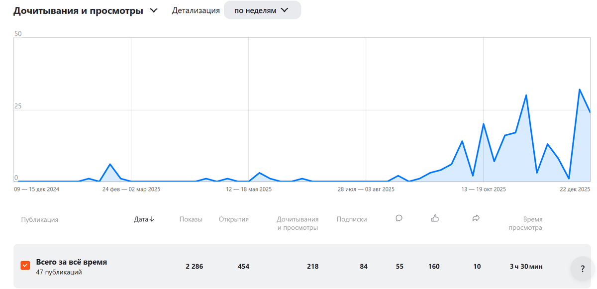 Результат оказался ожидаемым — академические и теоретические тексты стабильно собирают минимальное количество показов, просмотров и обратной связи.