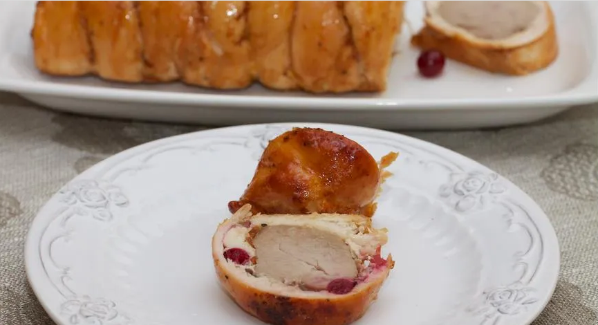 Нарежьте ломтиками толщиной 2–3 см. Подавайте с клюквенным соусом, зеленью и запечёнными овощами.