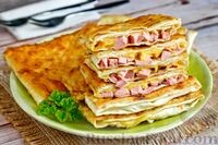 6 порций 25 мин (ваши 25 мин) Лавашники - жареные конвертики из тонкого лаваша с начинкой. В данном случае в качестве начинки используется колбаса и сыр, но вы можете её смело менять, ориентируясь на наличие продуктов в холодильнике и вкусовые предпочтения. Продукты (на 6 порций) Лаваш - 200 г (2 листа) Колбаса варёная - 200 г Сыр твёрдый - 100 г Яйцо - 1 шт. Вода - 1 ст. ложка Масло подсолнечное - 60 мл Пошаговый фото рецепт Лавашники с колбасой и сыром Подготовьте необходимые ингредиенты. Для приготовления таких ленивых пирожков я использовала два тонких лаваша прямоугольной формы размером 35х46 см. Вес каждого листа лаваша - 100 г. Для подобного рода блюд использовать лаваши квадратной или прямоугольной формы намного удобнее, нежели овальные - обрезков не останется! Итак, два лаваша я разрезала на полоски длиной 35 см и шириной около 15 см. Всего получилось 6 таких полосок. Для начинки варёную колбасу очистите от оболочки и нарежьте маленькими кубиками. Твёрдый сыр натрите на крупн