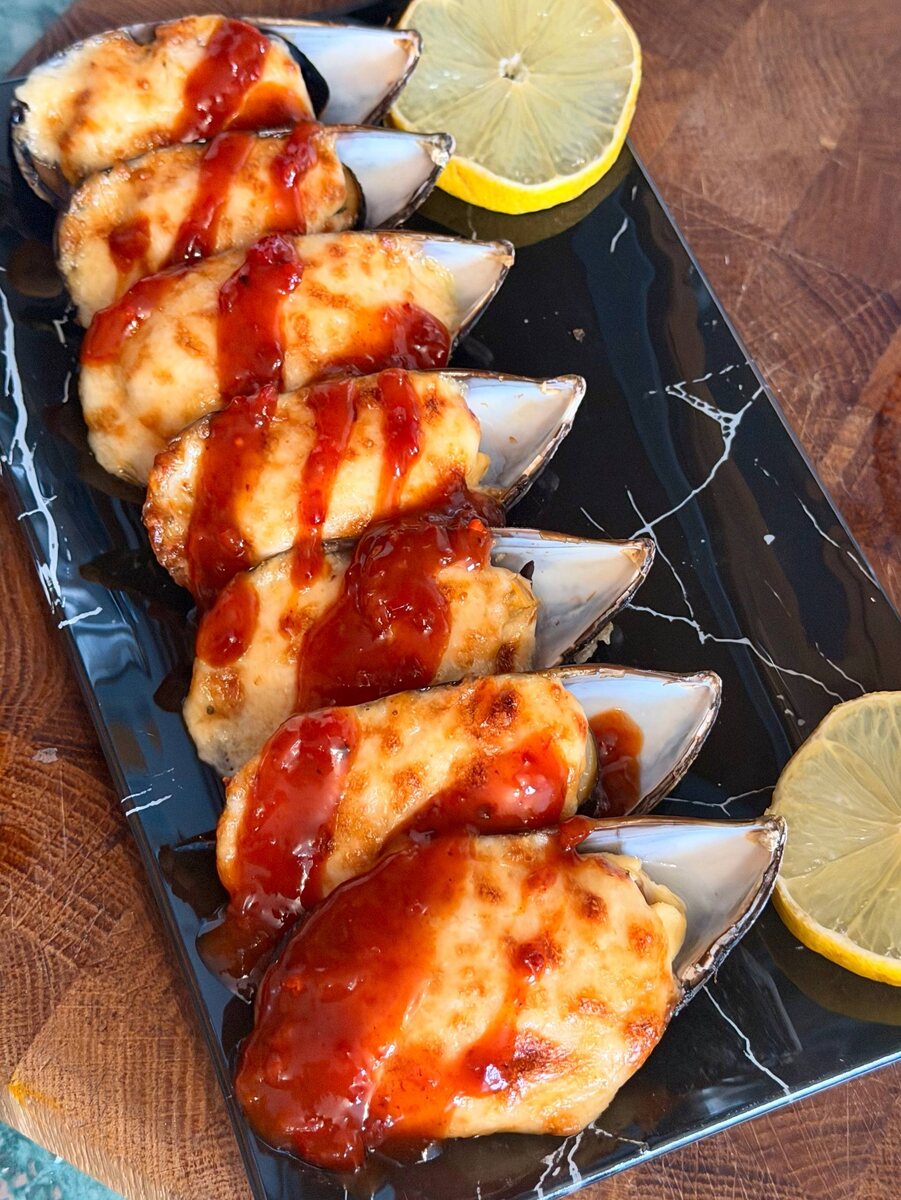 🧀 Секрет простой: чтобы «шапочка» не растекалась, разогрейте духовку на режиме «верх» до 230+ градусов на 5-7 минут. Шапочка из пармезана, сыра гауда, немного майонеза, сухого чеснока и капли соуса шрирача. В конце полил сладким чили соусом 😋