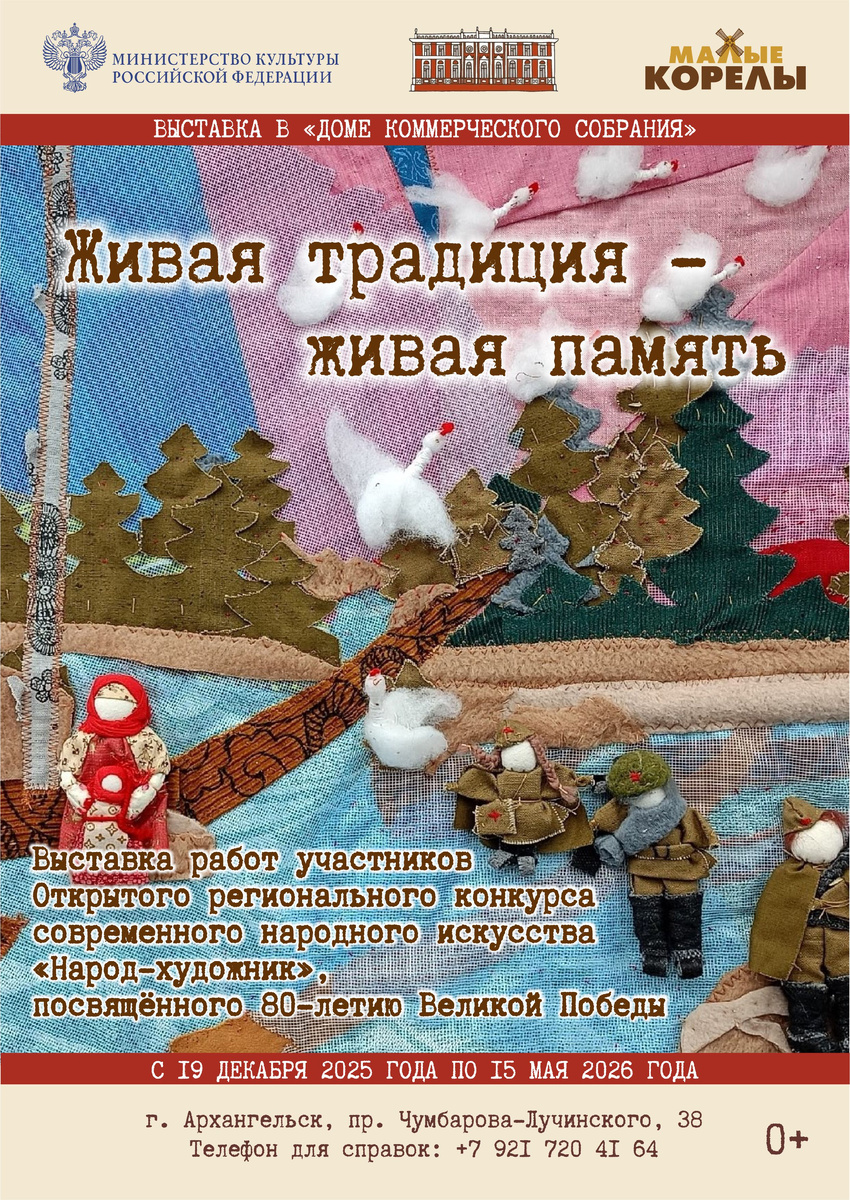 19 декабря в городском музейном комплексе «Дом Коммерческого собрания» открылась выставка «Живая традиция – живая память». Она стала итогом Открытого регионального конкурса современного народного искусства «Народ-художник», который в этом году был посвящён 80-летию Победы в Великой Отечественной войне. На выставке представлено более 60 предметов и композиций от более чем 45 мастеров и творческих коллективов из Архангельска, Северодвинска, Новодвинска и семи муниципальных округов Архангельской области, а также из города Вологды. «Выставка «Живая традиция – живая память» оформлена в виде тематических комплексов, где конкурсные изделия современных мастеров дополнены экспонатами из фондов нашего музея-заповедника, – отметила заведующая отделом этнографических программ и массовых мероприятий музея-заповедника «Малые Корелы» Юлия Волова. – И это создаёт особую атмосферу экспозиции, демонстрируя связь поколений и преемственность традиций». Участникам конкурса «Народ-художник» было предложено