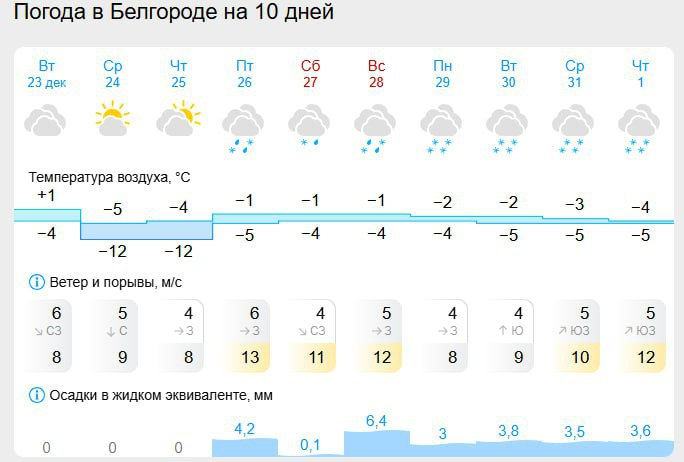 Белгородцев ожидает резкое похолодание и сильные магнитные бури. Пик морозов придётся на среду и четверг. Днём температура опустится до –4…–5 °C, а ночью – до –12 °C. В выходные прогнозируется небольшое потепление: около –1 °C днём и до –4 °C ночью, возможен снег с дождём. Кроме того, на регион обрушится сильная геомагнитная буря. 25-26 декабря ожидается умеренная активность, а 30 декабря – пик геомагнитных возмущений. В эти дни возможны головные боли. Могут наблюдаться резкие перепады настроения, упадок сил и депрессия.