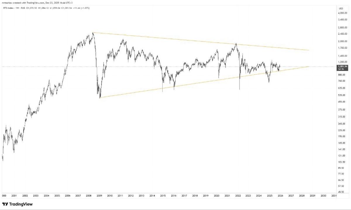 🇷🇺 Сегодня пришел К осознанию - почему российский инвестор не любит российский фондовый рынок. Перед нами график индекса РТС. По сути своей, это мамба (ММВБ) помноженная на курс доллара. И что мы видим? График находится на уровне 2005 года! Т.е. инвестируя в рубле в российский рынок 20 лет назад, мы продолжаем стоять на месте 🔴 Это мы ещё инфляцию сюда не добавили 😢
