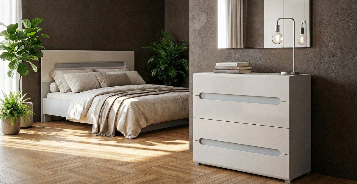 Мебель без декора, сложных фрезеровок и визуального шума, чёткая геометрия, гладкие фасады, аккуратные интегрированные ручки или вырезы.