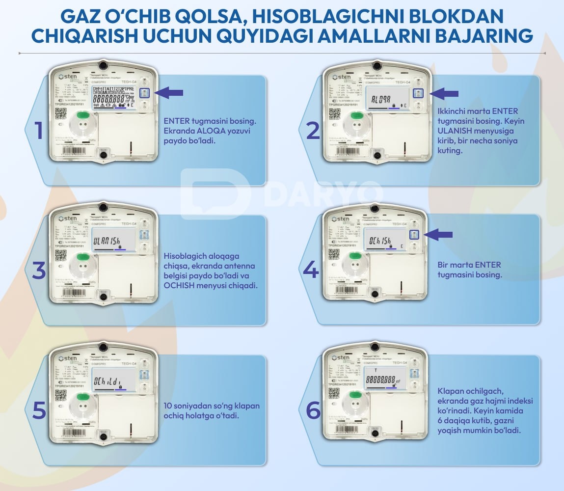 “Daryo” tayyorlagan infografikada gaz hisoblagichni qayta ishga tushirish chorasi aks etgan.