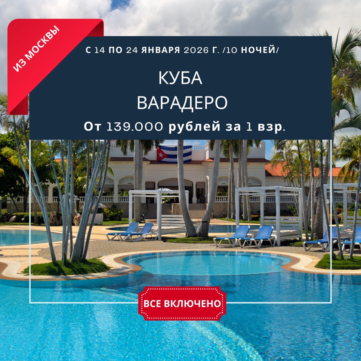 Варадеро. С 14 по 24 января 2026 г. /10 ночей/. От 139.000 рублей за 1 взрослого. Все включено! Стоимость указана за самый бюджетный вариант размещения, доступный для бронирования. Быстрое подтверждение отеля и билетов. IBEROSTAR TAINOS 4⭐️ standard room 139 000 руб GRAND MEMORIES VARADERO (EX. RIU VARADERO) 5⭐️ standard room 144 000 руб MELIA LAS ANTILLAS ADULTS ONLY 16+ 4⭐️ deluxe room 152 000 руб PARADISUS PRINCESA DEL MAR ADULTS ONLY 18+ 5⭐️ paradisus junior suite 170 000 руб BELLA COSTA (EX. IBEROSTAR BELLA COSTA) 4⭐️ standard room without balcony 170 000 руб BLAU VARADERO ADULTS ONLY 4⭐️ superior bay view 172 500 руб MELIA VARADERO 5⭐️ Классический номер 174 000 руб SOL VARADERO BEACH ADULTS ONLY 16+ 4⭐️ sol room 175 000 руб SOL PALMERAS 4⭐️ Бунгало 1 спальня 175 000 руб SOL CARIBE BEACH 4⭐️ sol room 185 000 руб IBEROSTAR SELECTION VARADERO (EX. IBEROSTAR VARADERO) 5⭐️ standard room 199 000 руб MELIA INTERNACIONAL HOTEL 5⭐️ Классический номер 217 400 руб MELIA LAS A